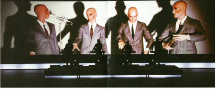 When Florian Schneider decided to walk out late last year, the band quickly arranged for his simulated head to be removed from the fourth robot and replaced by one of Stefan Pfaffe. However, the backdrop video still shows Florian's head rather than Stefan's, although it seemed to have its head in its hand as if in some sort of symbolic gesture.
